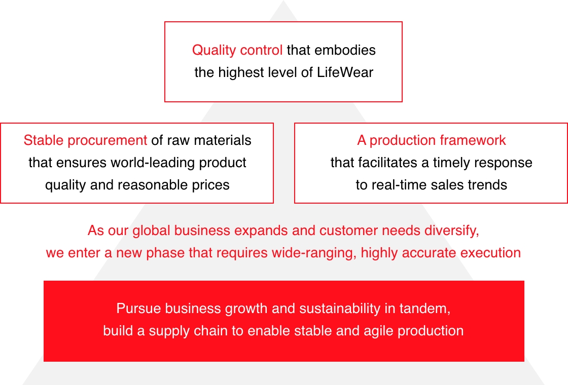 To become the world’s best-loved No. 1 brand, it is vital to pursue operational growth and sustainability in tandem and build a supply chain that facilitates stable but flexible production. The building of such a system is underpinned by the strong trust we have nurtured with the production partners to whom we outsource our fabric production and garment sewing. We share our commitment to high-quality production and proper procedures. This enables us to deliver truly great clothes to customers worldwide. We have built long-standing win-win relationships and grown together with partner factories that share our philosophy and values. In 2023, we began extending these partnerships to upstream raw materials procurement, and we are working tirelessly to stabilize quality and costs, improve lead times, reduce environmental impact, uphold human rights, and improve working environments across all processes. We want to achieve a business model that allows us to produce and sell the right volumes of the exact products that customers want, at the exact time they want them; while minimizing impacts on people and the environment.